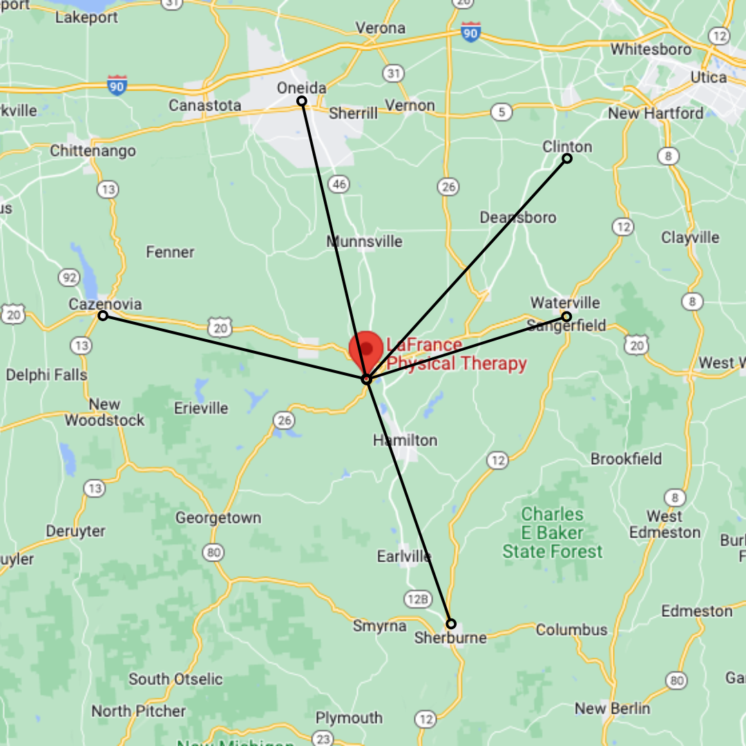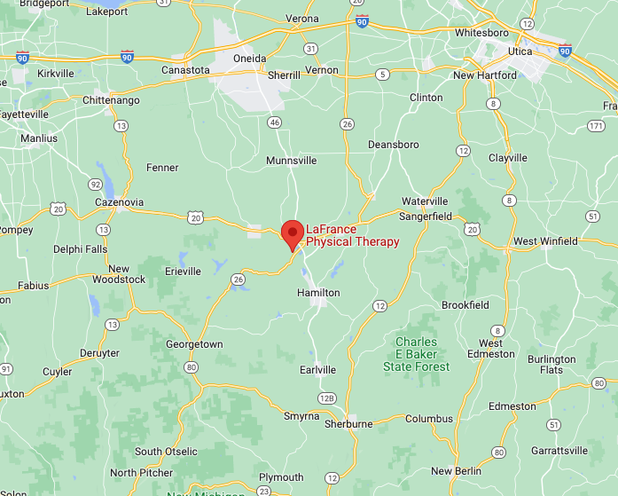 Being just a minute away from Leland Pond and Mosher Farms, we are just an 8 minute drive from Hamilton, NY and a 5 minute drive from Morrisville, NY! Whether you are a college student, a high school athlete, a working adult, or retired individual, LaFrance Physical Therapy welcomes all members of our local communities for treatment.
